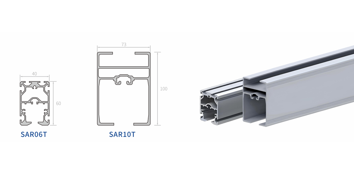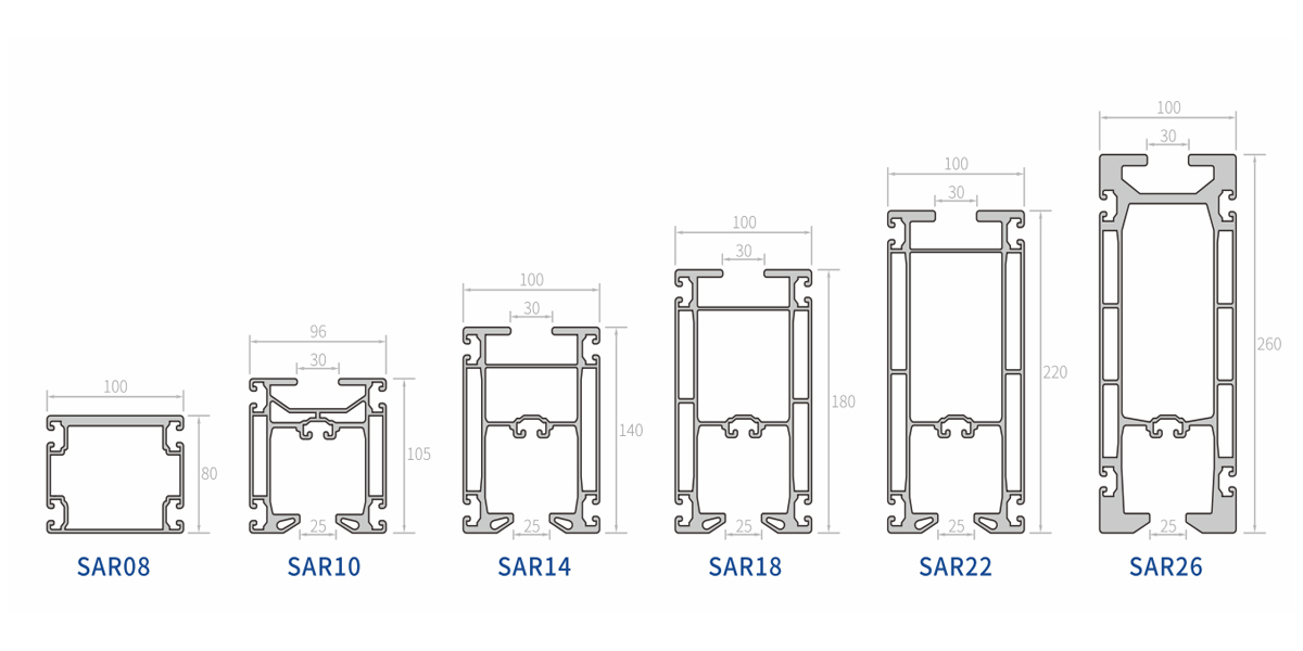 | SAR08 | Aluminiu, anodizat | 4,1 kg/m | 152cm^4/202cm^4 | 30cm^3/40cm^3 |