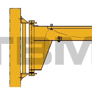 | Axa de rotire a macaralei cu braț de 270° este situată pe două urechi deasupra coloanei. Lagărele de susținere plane și bucșele de cupru auto-lubrifiante sunt instalate între urechile superioare și inferioare și axa de rotire. Acest lucru asigură o rotire flexibilă și atenuează oscilația inerțială a brațului când se oprește. Limitele externe ale unghiului de rotire sunt prevăzute pentru a regla unghiul de rotire al brațului. This structure effectively reduces the overall headroom of the jib crane. The 270° slewing mode is manual by default. |